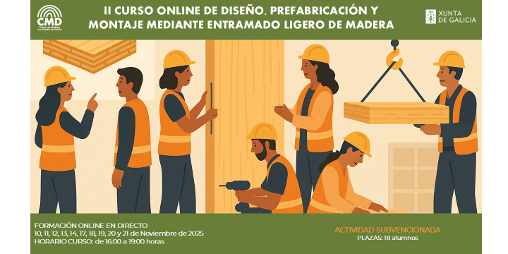 El Cluster da Madeira e o Deseño de Galicia, con la ayuda de la Axencia Galega da Industria Forestal, organiza el II Curso Online de Diseño, Prefabricación y Montaje mediante Entramado Ligero de Madera. El objetivo de esta formación es introducir a profesionales de la construcción en las especificidades del diseño y construcción con entramado ligero de madera. Se trata de una formación específica sobre los diferentes tipos o sistemas constructivos basados en entramado ligero de madera, sus diversas posibilidades de composición, la estructura de sus capas y los diferentes motivos de su utilización, las etapas de diseño y fabricación.